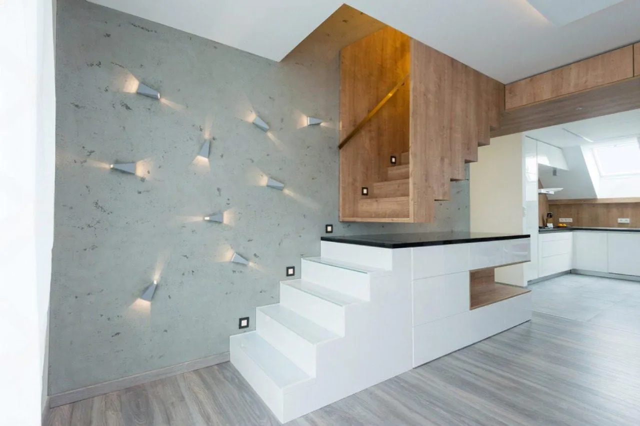 Полезный совет: Чтобы усилить эффект «парящих» ступеней, используйте направленную подсветку. Небольшие точечные светильники, установленные в стене под каждой ступенью или над ними, создадут в вечернее время потрясающую игру света и тени, подчеркнув воздушную геометрию лестницы.